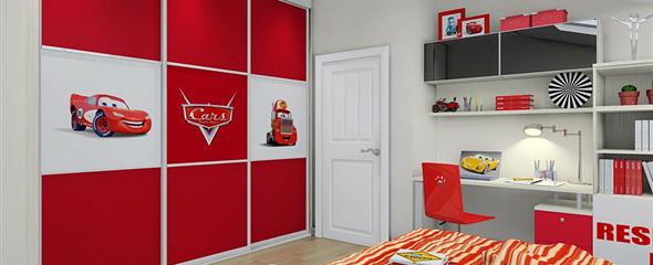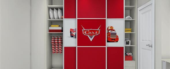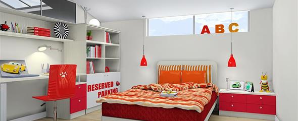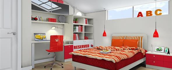 4、活泼且鲜艳的红色调,富有童趣的面板喷绘,工工整整的柜体拼搭在斜顶的天花衬托下显得儿童房的氛围更加的浓烈。